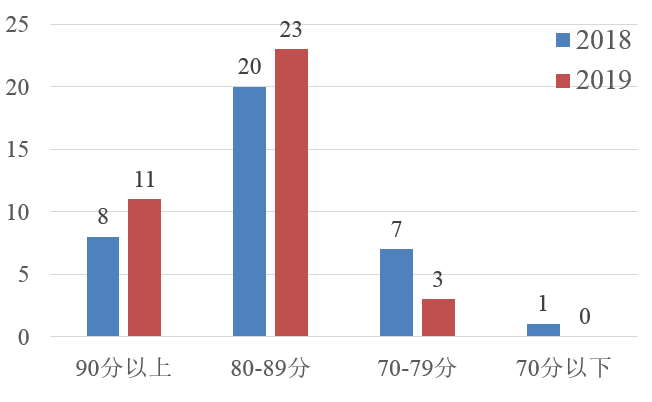 (一)政府采购信息公开整体水平明显提升。各地区高度重视政府采购信息发布平台建设,普遍加强了对采购项目信息发布的监管力度,其中,北京、福建、广东、天津等地区政府采购信息公开工作一直稳定在较高水平。从得分分布看(图1),高分段地区增多、低分段地区减少,90分以上地区由2018年的8个增加到2019年的11个,80分以下地区由2018年的8个减少到2019年的3个,首次实现没有低于70分的地区。